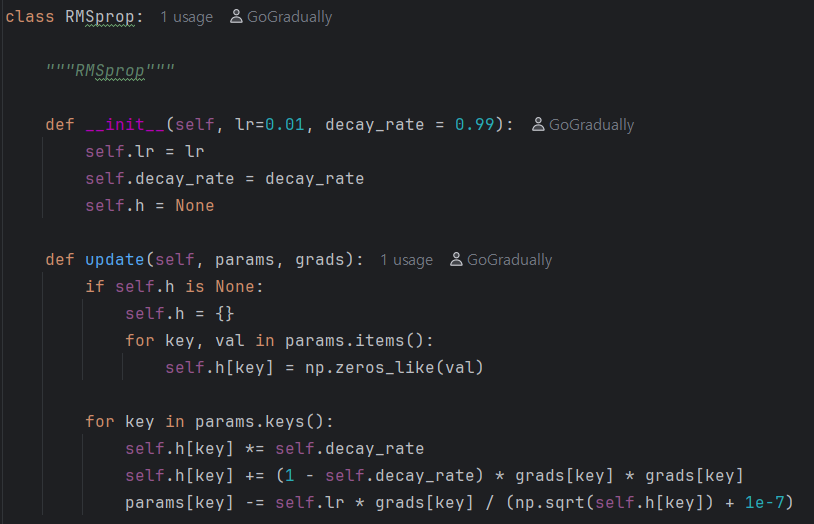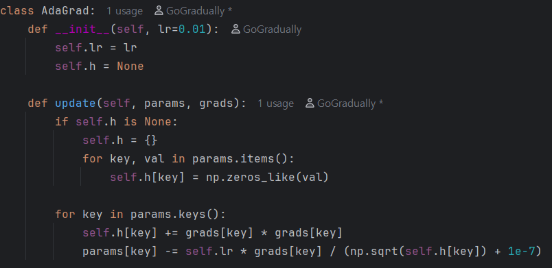 마지막 줄에 1e-7은 self.h 에 0이 담겨있다고 해도 0으로 나누는 사태를 방지한다.
