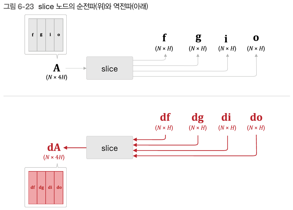 반면, LSTM의 은닉상태 h는 RNN계층과 마찬가지로 다른 계층으로(위쪽으로) 출력된다.