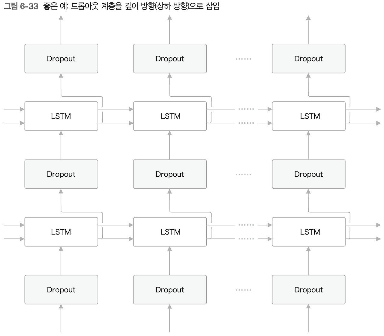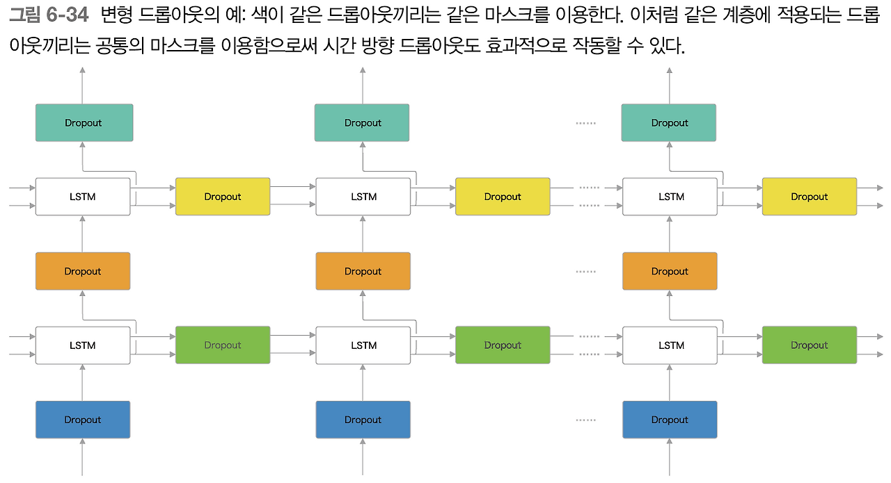 RNN에서 시계열 방향으로 드롭아웃을 넣어버리면, 학습 시 시간이 흐름에 따라 정보가 "사라질 수" 있다.