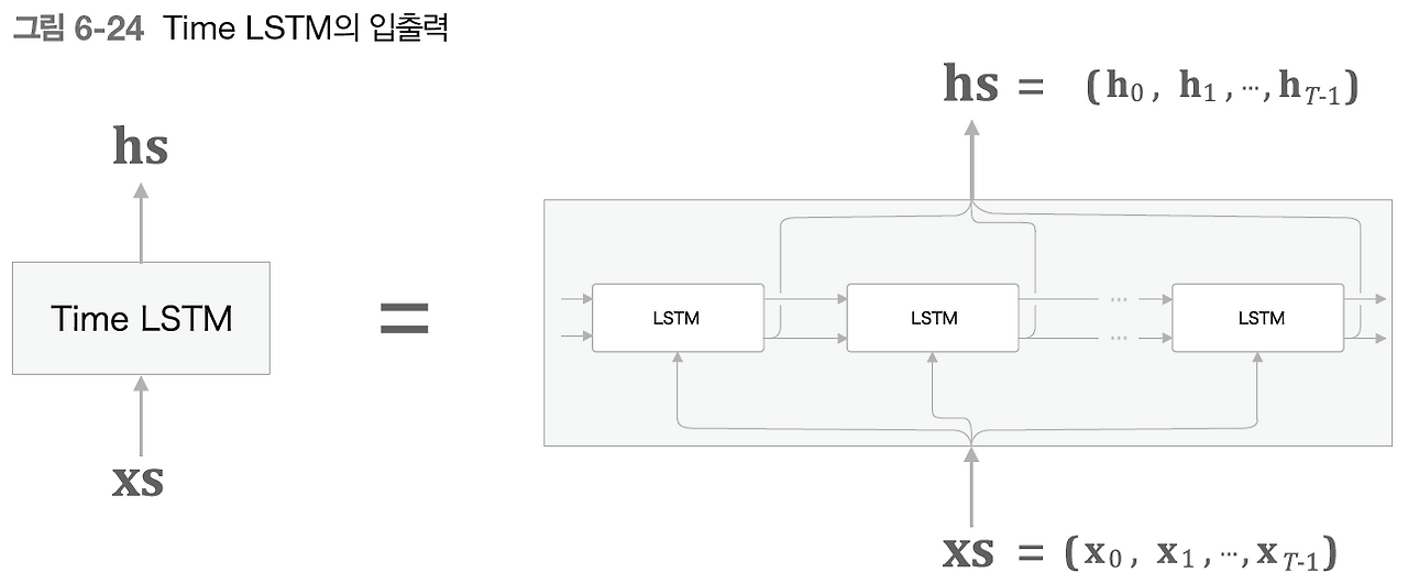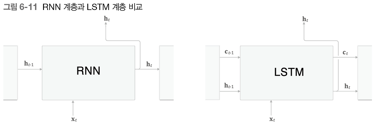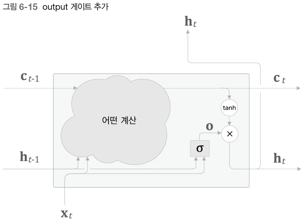 LSTM의 출력을 받는 쪽에서 보면 LSTM의 출력은 은닉 상태 벡터 h 뿐이다.
