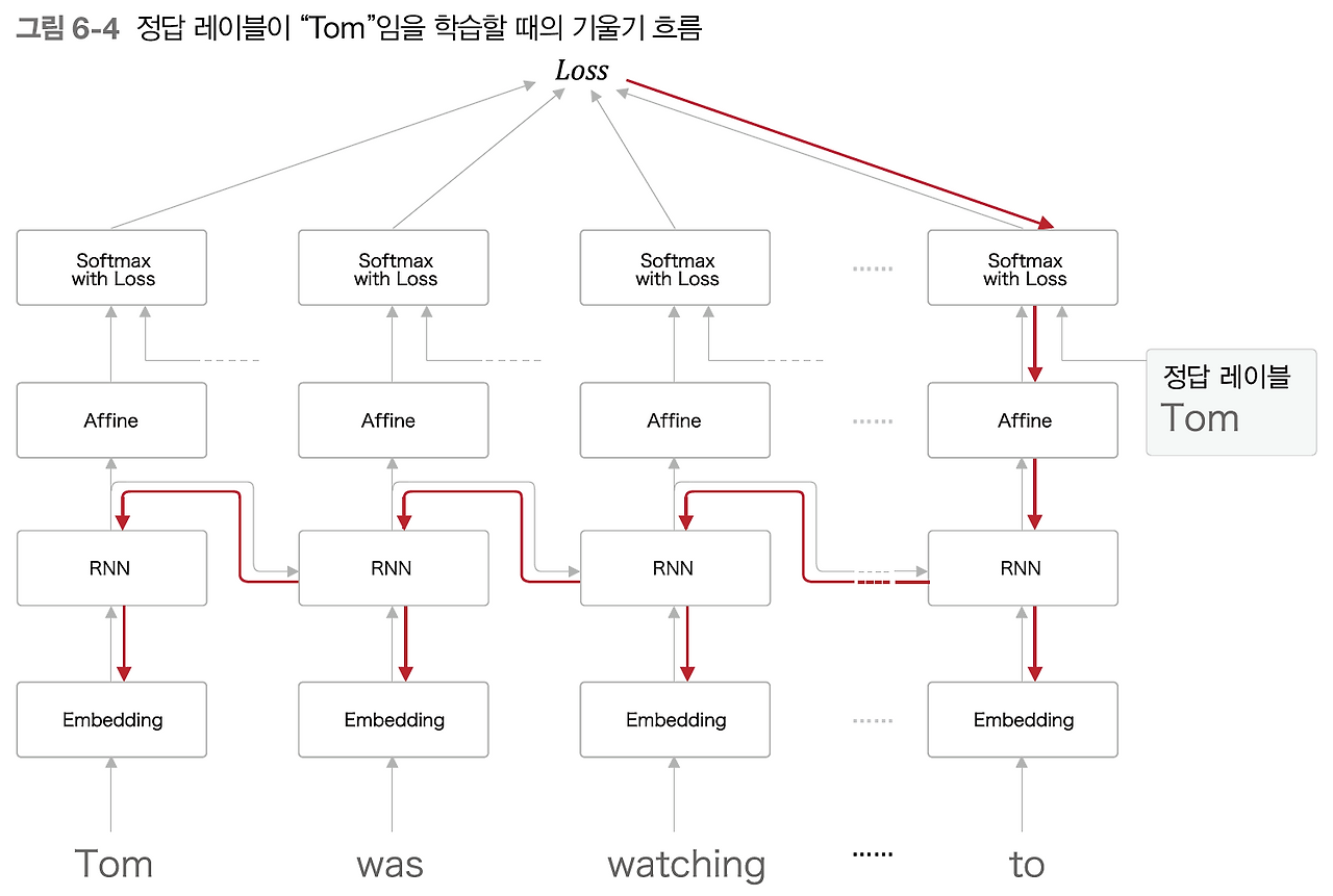 여기에서는 정답 레이블로 "Tom"이라는 단어가 주어졌을 때, RNNLM에서 기울기가 어떻게 전파되는지 살펴보자.
