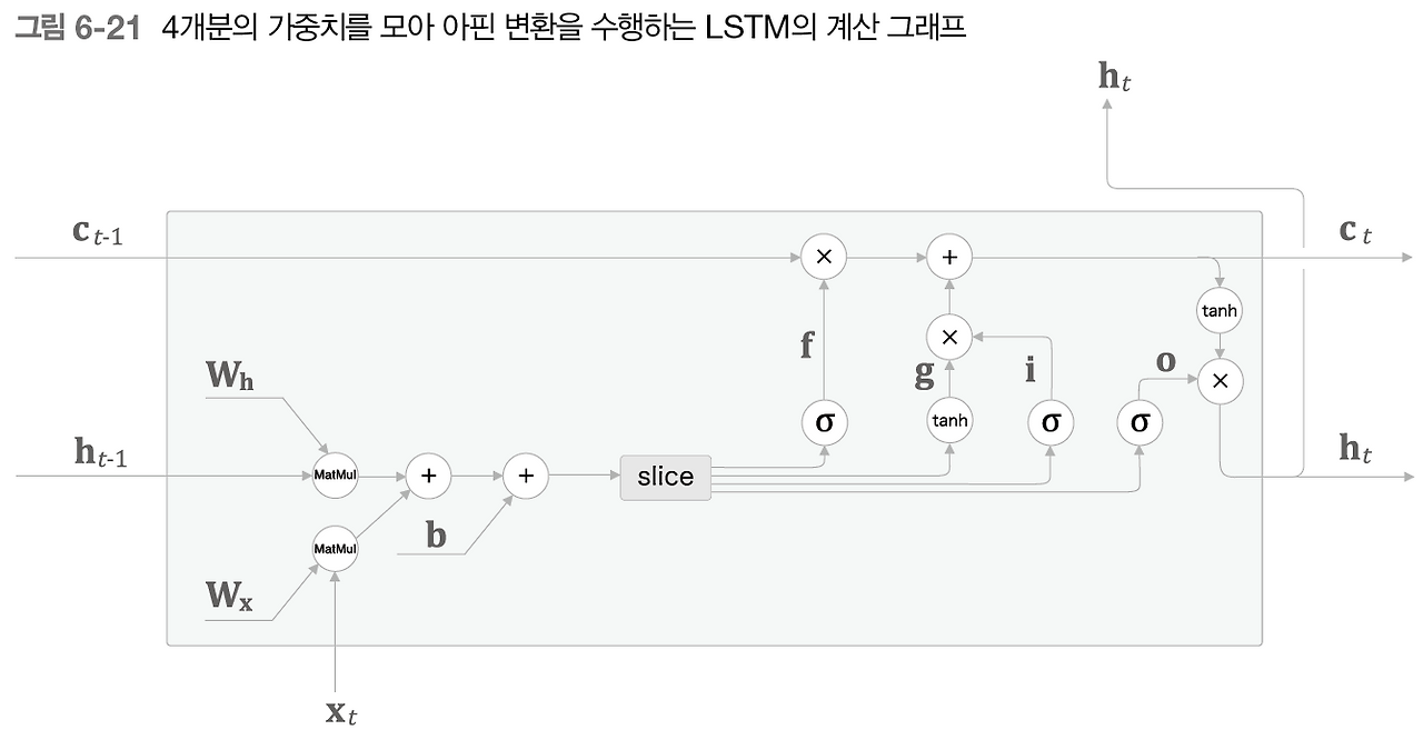 위 그림에서 보듯, LSTM 계층에 인터페이스에는 c라는 경로가 추가로 존재한다.