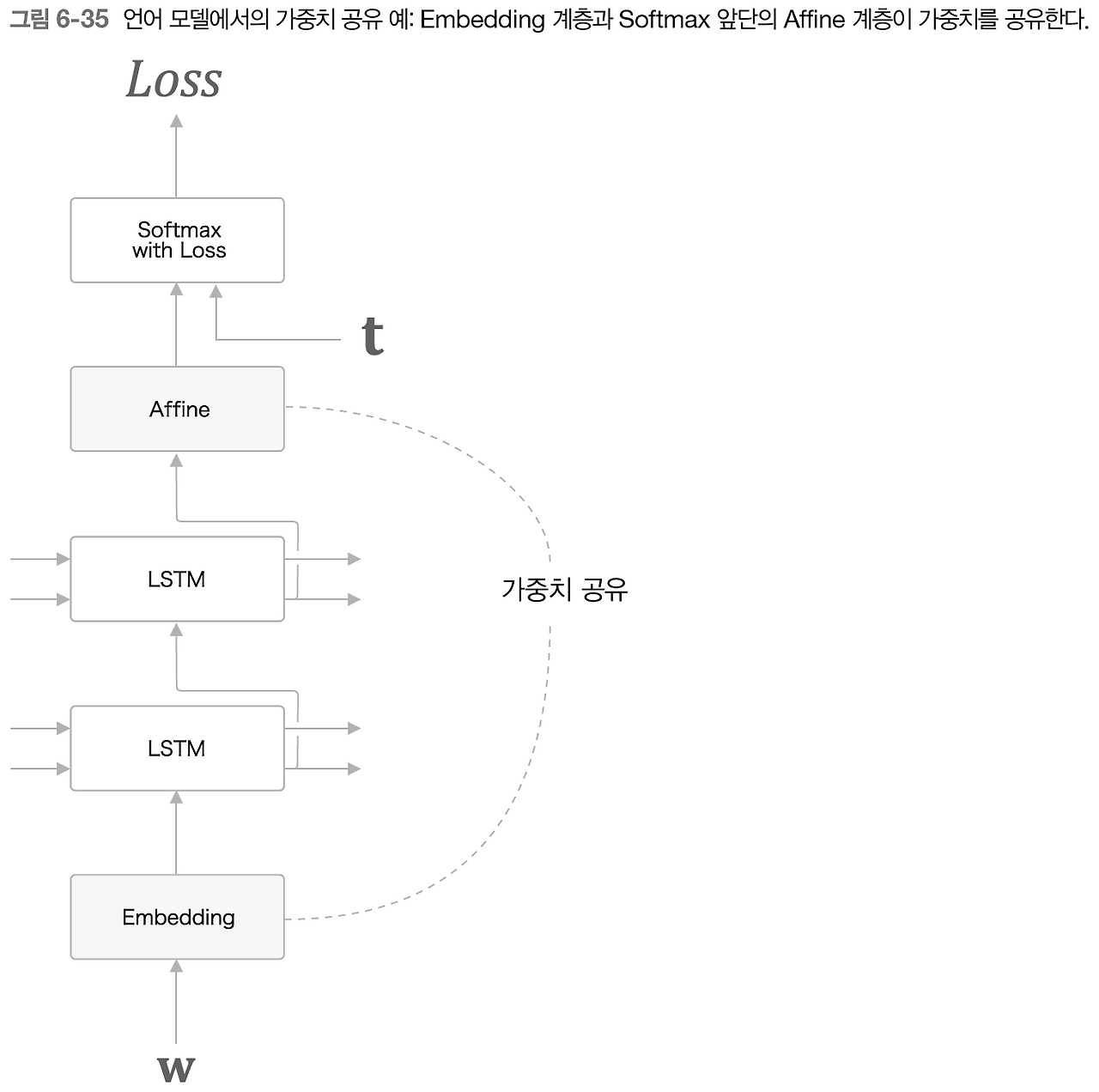 위 그림처럼 Embedding 계층의 가중치와 Affine 계층의 가중치를 연결하는 기법이 가중치 공유이다.