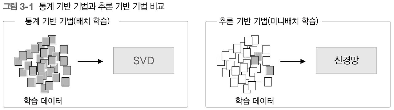반면 추론 기반 기법은, 예컨데 신경망을 사용하는 경우에는 미니배치로 학습하는 것이 일반적이기에, 데이터가 많은 상황에서도 데이터를 나눠서 차근차근 작업할 수 있다.