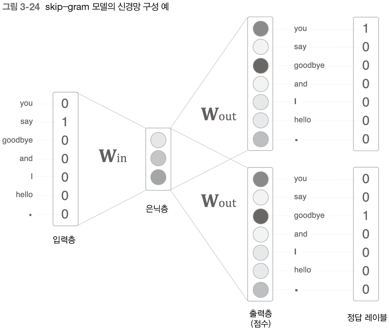- 반대로 skip-gram 모델은 하나의 단어(타깃)로부터 다수의 단어(맥락)을 추측한다.
