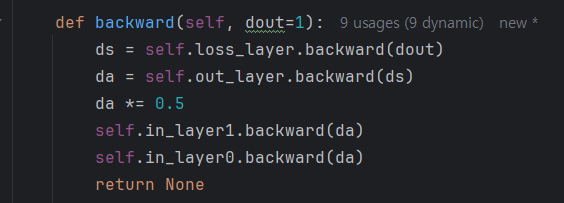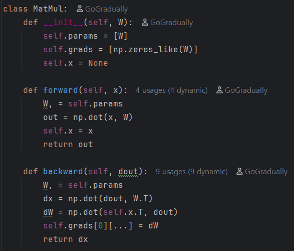 이제 forward() 메소드를 한번 호출한 다음 backward() 메소드를 한번 실행하는 것만으로 grads 리스트의 기울기가 갱신된다.