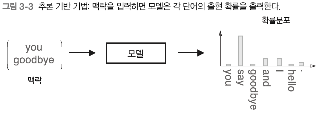 - 추론 기반 기법은 추측하는 것이 목적이며, 그 부산물로 단어의 분산 표현을 얻을 수 있다.