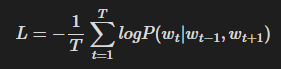 이 식에서 보듯, CBOW 모델의 손실 함수는 단순히 위에서 정의한 식(확률)에 로그를 취한 다음 음수를 곱했다.