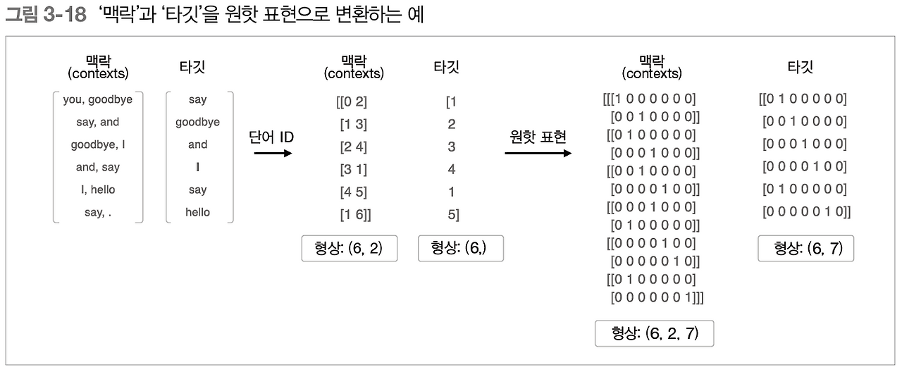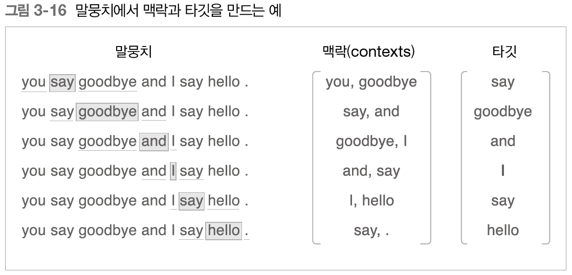 즉, 맥락 -> 타깃 형태의 데이터 이용해야 하고, 맥락이 입력되었을 때, 타깃이 출력되는 형태로 구성해야 한다.