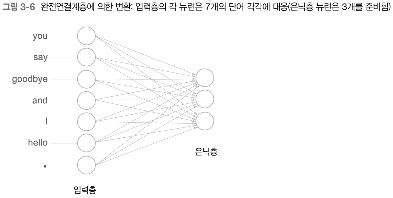 출력층의 뉴런은 총 7개인데, 여기서 중요한 것은 이 뉴런 하나하나가 각각의 단어에 대응한다는 것이다.