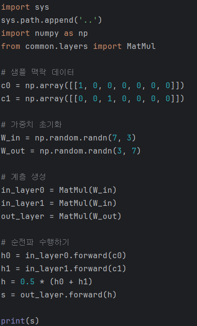 CBOW는 위에서 언급했듯 맥락 -> 타깃 추측을 수행하는 신경망이다.