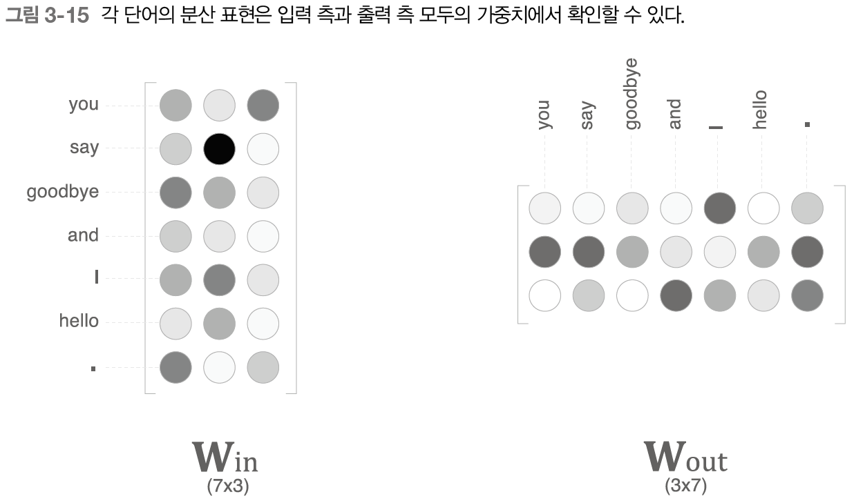CBOW 모델의 학습에서는 W_in과 W_out 모두에 단어의 출현 패턴을 파악한 벡터가 학습된다.