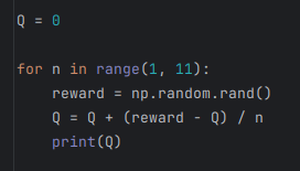 - Qs: 각 슬롯머신의 행동 가치 10개를 저장한 넘파이 배열