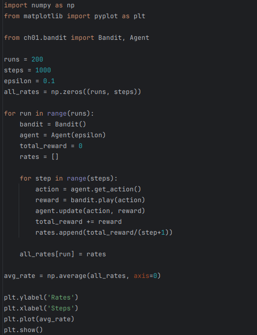 - np.argmax(self.Qs)를 통해 가장 행동 가치가 큰 슬롯 머신을 가져와 행동을 수행한다.