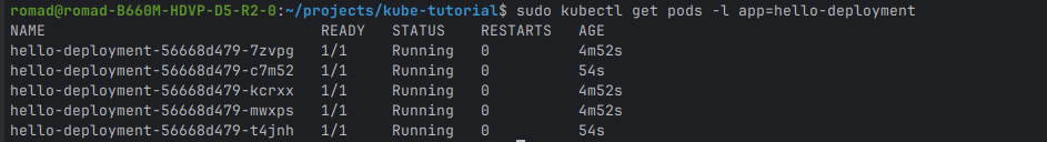 hello-deployment-5c8b5bbd6f라는 ReplicaSet이 하나 있고, DESIRED(요구) 3개에 CURRENT(현재) 3개를 충족시켜 READY 상태임을 보여준다.
