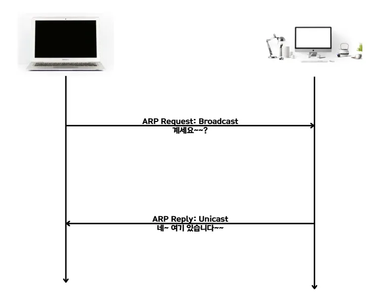 - 수신지 IPv4주소를 가지고, Broadcast 방식으로 이더넷 네트워크 내 모두에게 물어봐서 수신지 MAC 주소를 구한다.