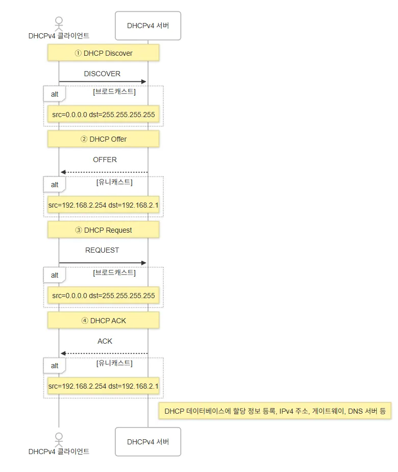- DHCP는 Discover, Offer, Request, ACK 와 같은 순서로 IP 주소를 할당한다.