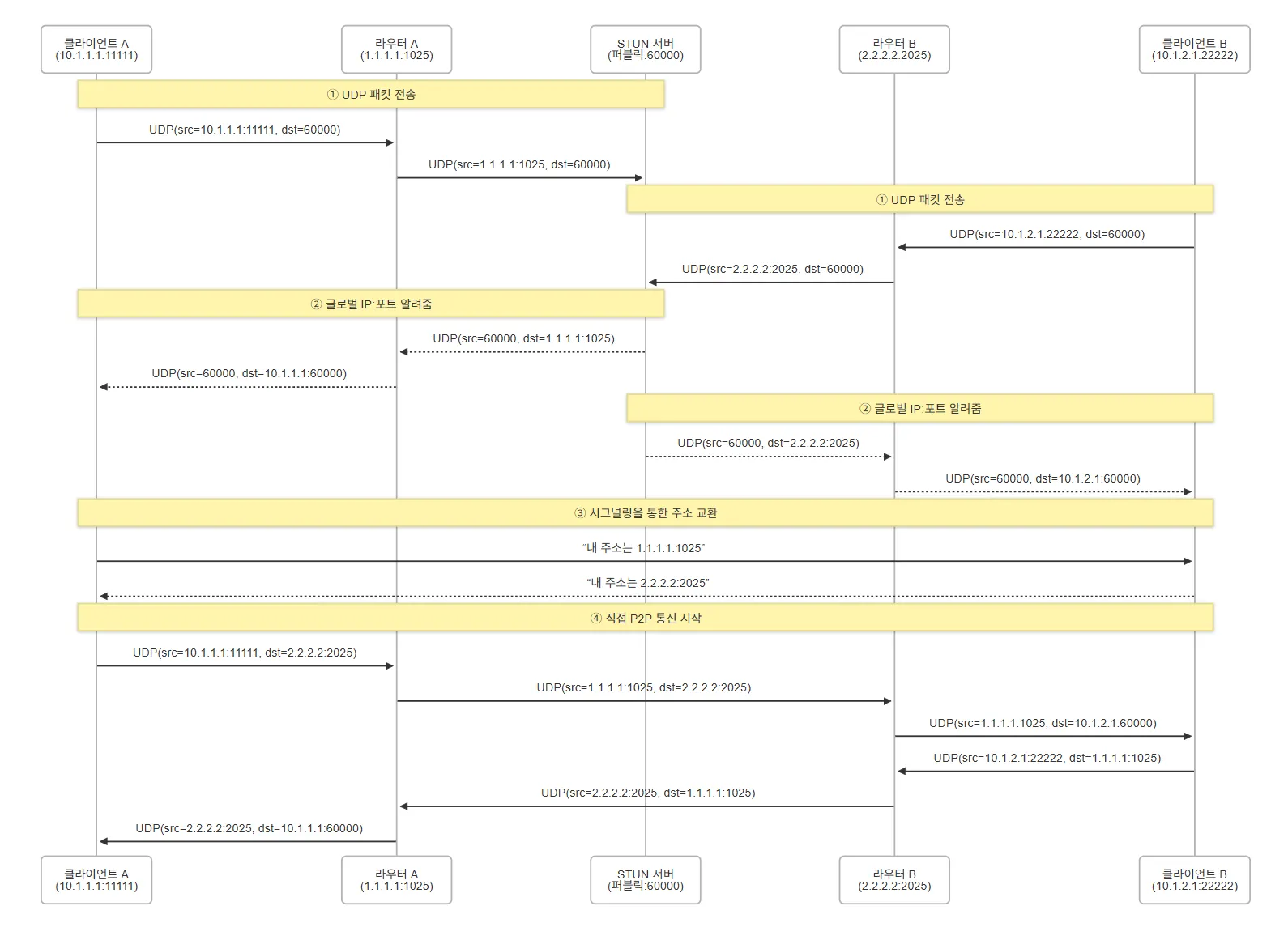 - 각 단말은 STUN 서버와 UDP로 통신해, 자신과 통신 상대의 글로벌 IPv4 주소와 포트 번호를 식별한다.