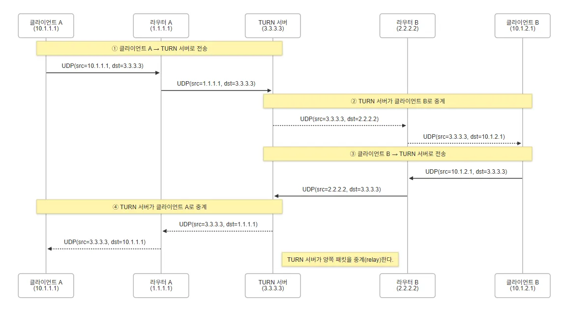 - 각 단말은 TURN 서버에 액세스해, TURN 서버를 통해 서로 데이터를 교환한다.