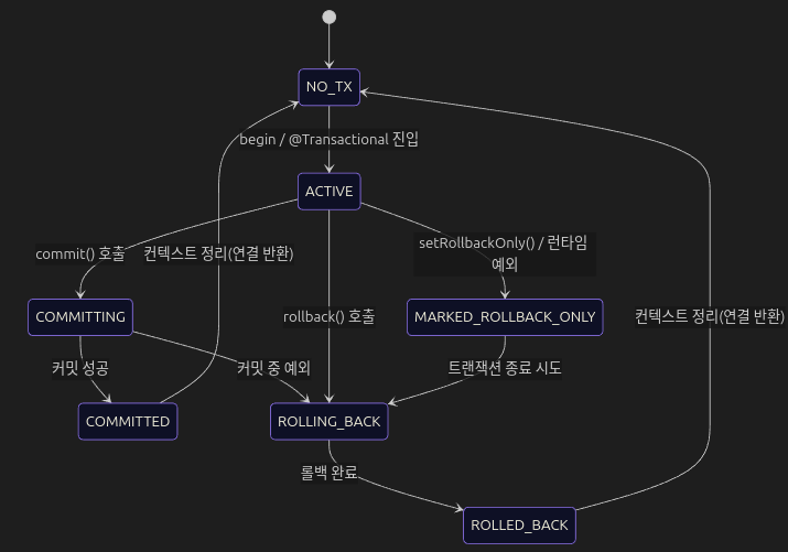 이 상황에서 다시 트랜잭션을 걸려면 NO_TX 상태로 전이가 된 상태여야 한다.
