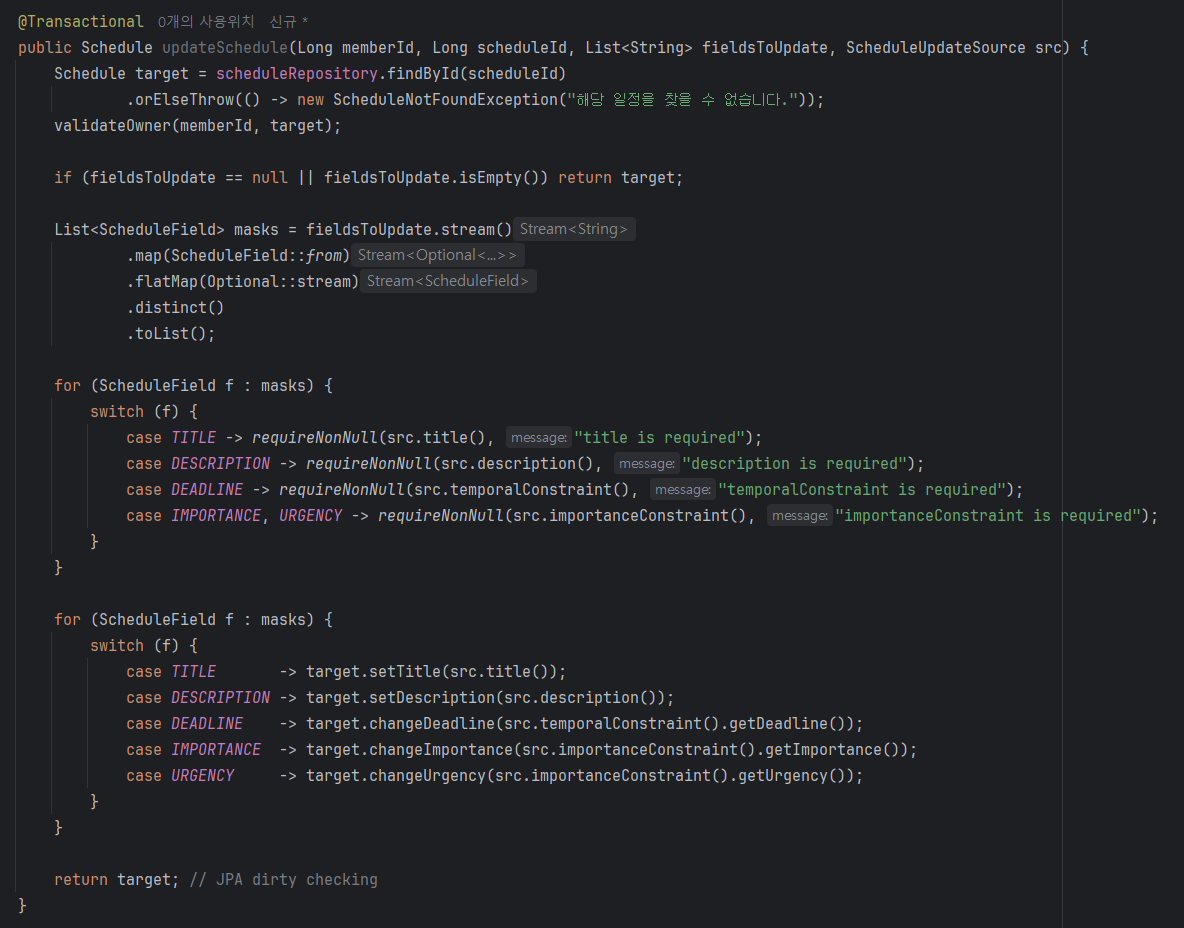 그러면 Schedule 엔티티에 Patch 객체를 활용하는 메소드를 추가할 수 있다.