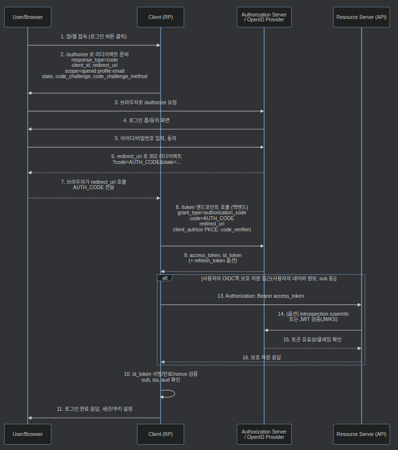 /authorize엔드포인트로 요청을 보낸다. - OpenID Provider가 사용자에게 로그인 폼과 동의 화면을 제공한다.