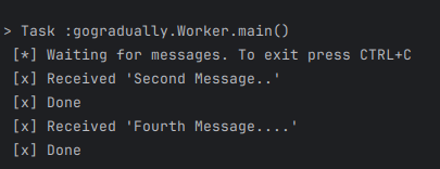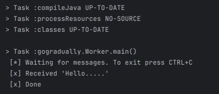 이제 이 NewTask를 실행하면, 아래와 같이 워커에서 5초가 걸린 뒤 작업이 완료되는 모습을 확인할 수 있다.