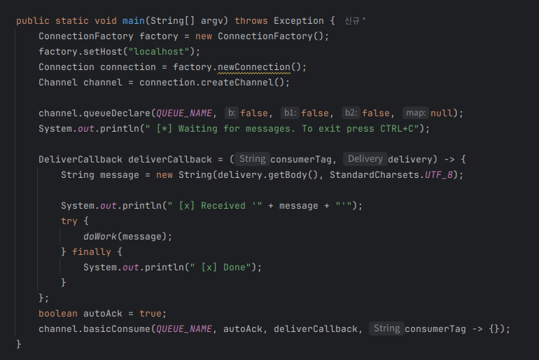 이 queueDeclare변경 사항은 생산자 코드와 소비자 코드 모두에 적용되어야 한다.