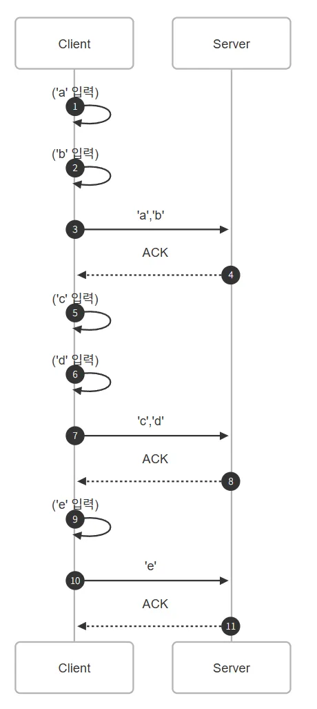 - 이때 확인응답 지연 알고리즘으로 인해 TCP가 ACK를 일정 시간(일반적으로 0.1~0.2초) 모으고 있다가 데이터를 보낼 기회가 생기면 같이 보낼 수 있다.
