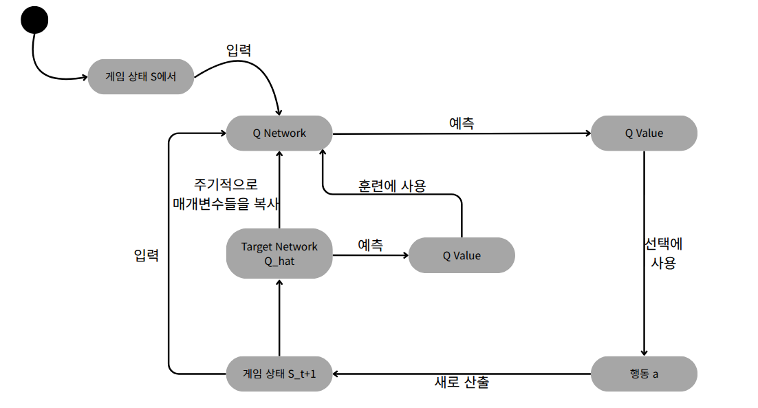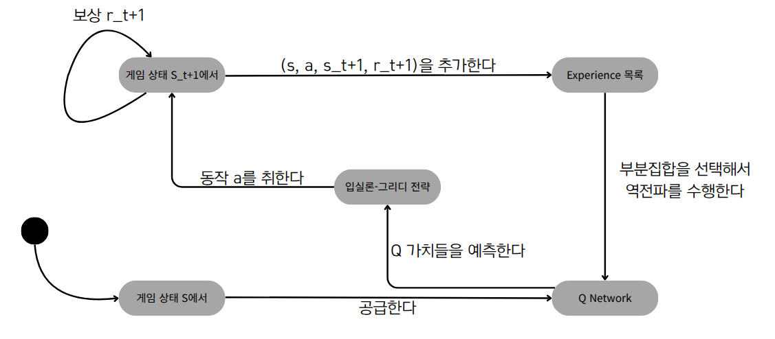 본 내용은 심층강화학습 인 액션 도서를 참고하여 작성되었습니다. 심층 강화학습 인 액션 - 예스24프로젝트로 배우는 심층 강화학습의 이론과 실제!이 책 『심층 강화학습 인 액션』은 환경이 제공하는 직접적인 피드백에 기반해서 환경에 적응하고 자신을 개선해 나가는 에이전트의 구현 방www.yes24.com 과거에도 Q함수를 신경망으로 표현하려던 시도는 있었지만, 이는 다음과 같은 문제가 있어 해결하지 못했다.신경망 학습 연산의 비용이 감당 불가능했다.catastrophic forgetting 문제가 있었다. - ER(Experience Replay)신경망 자체의 편향을 제거하기가 어려웠다. - Target Network시대가 변화하며 GPU의 병렬 연산의 성능이 대폭 향상되었고,구글 딥마인드에서 2013년에..